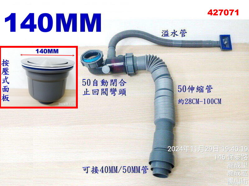 (140MM按壓式側排單槽下水器) 304不銹鋼水槽下水頭 廚房水槽下水器 水槽下水器配件 071
